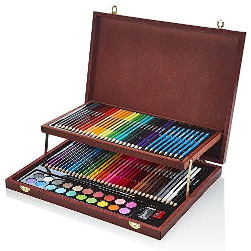 This high quality colouring and sketch studio by ArtWorx features a deluxe wooden storage case with fastening mechanisms making it perfect for travel or moving around the home. It containts everything you need for the full art experience. Would make a great gift for any aspiring young or older artist.