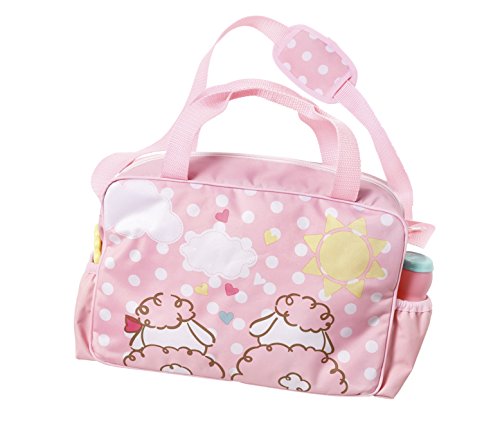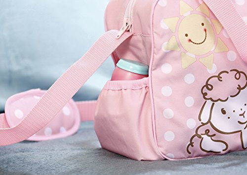 The two sheep on Baby Annabell's changing bag look very excited. Where will we be going on our next trip? To the playground, the park, to see grandma and grandpa? After all, the practical bag is always around wherever you go. It contains four accessories that make changing child's play when out and about:a changing mat in a sweet polka dotted fabric, a powder bottle, a teething ring to play with and, of course, a spare nappy.