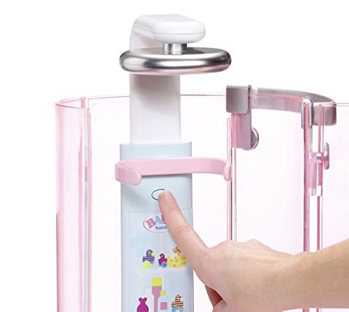 BABY born Rain Fun Shower. A real working shower for BABY born and BABY born Sister. Includes height adjustable shower head with water flow regulator, opening and closing door, harness and towel. Requires 4 x LR6/AA batteries. Styles may vary. For ages 3 years and over.