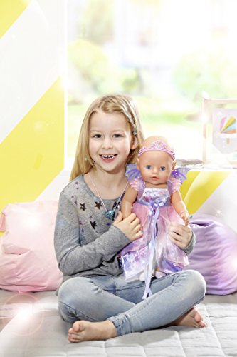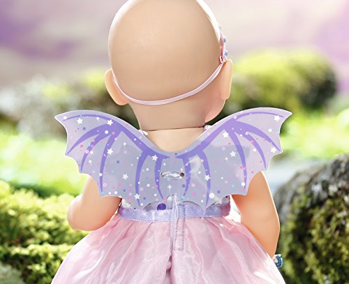 BABY born Interactive Wonderland Fairy Rider doll is so enchanting with her beautiful fairy-themed dress, wings, tiara, necklace and shoes. Featuring 9 functions, including controlled wetting & pooping on the potty, drinking & feeding, tearing, opening/closing eyes, and moving arms and legs. Includes 11 accessories: 2 bracelets, 1 necklace, 1 plate with spoon, 1 bottle with cap, 1 sachet of special food, 1 potty and 1 dummy. No batteries required. For ages 3 years and over.