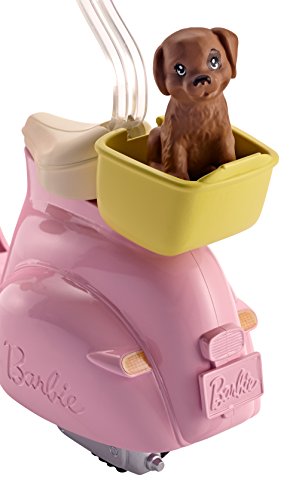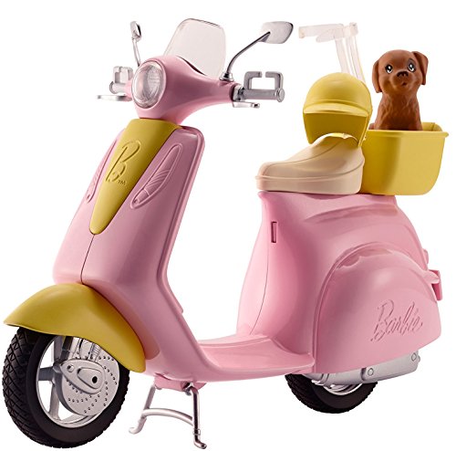 Scoot into fun with this Barbie moped. It comes with a pet friend who's always ready to ride! Designed in pink and yellow with silvery accents, the moped is trendy and stylish. Place Barbie doll (sold separately) on the seat where a clip holds her in place. Lift up the kickstand and push to head into imagination. Bring along the puppy in the yellow basket on back. And a yellow helmet for Barbie doll lets her ride safely in style. Whether you are going for a short ride or driving into adventure, this moped is ready to roll! Includes Barbie moped with basket, puppy and helmet; doll not included. Colors and decorations may vary.
