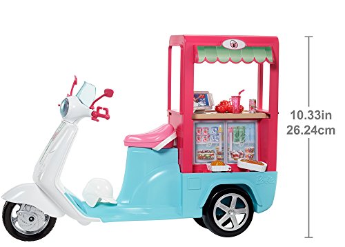 Roll into career adventure with the Barbie Bistro cart -- it has all the ingredients to let young foodies explore their dreams! bright colours and a unique design on this doll vehicle -- a scooter in front and a food truck in back -- inspire all kinds of storytelling. Food, drinks and a register complete the order for fun. Display the treats on top of the vehicle's Bistro counter or below (they look good enough to eat!). plug-in pockets are designed to hold the pieces in place for active play and scooting action. With its slim three-wheel design, Barbie doll (sold separately) can take this vehicle to her customers in all types of locations. Just push on its rolling wheels to get the story started. A white doll helmet is included for workplace safety, and handlebars with clips and a seatbelt hold a doll in place until the next stop. Young imaginations will have so much fun exploring all the roads and destinations before them because with Barbie, you can be anything! includes Barbie Bistro cart with themed accessories; doll not included. Colours and decorations may vary.