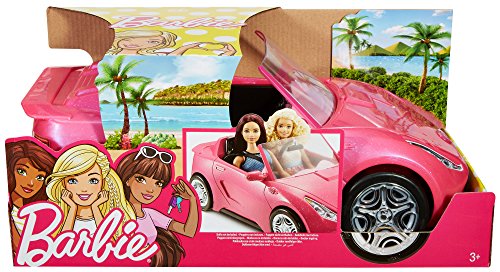 Hit the open road with the Barbie convertible the storytelling possibilities are endless! Designed in sparkly pink with the Barbie silhouette as hood ornament, the two seater vehicle is Barbie signature style. The car's sporty shape has a spoiler in back and silvery wheels that really roll. The interior is modern in black with realistic upholstery labels and seatbelts for the dolls (sold separately). Push the convertible to drive wherever imagination can take you because with Barbie, anything is possible! Includes Barbie glam convertible; doll not included. Colors and decorations may vary.