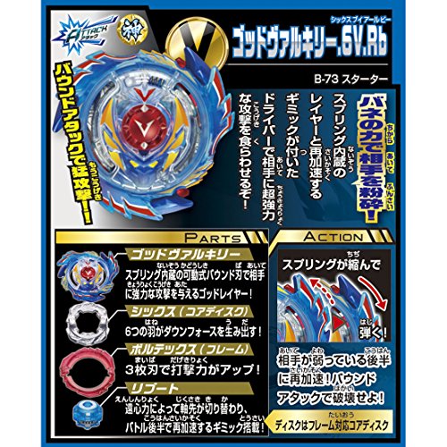 Let it rip with Beyblade Burst, the third generation of the popular Beyblade franchise! Play against your friends or join the battle at the tournaments to test to your skill. The God Valkyrie.6V.Rb is a Attack-Type Beyblade. Compatible with Beyblade Burst product only.