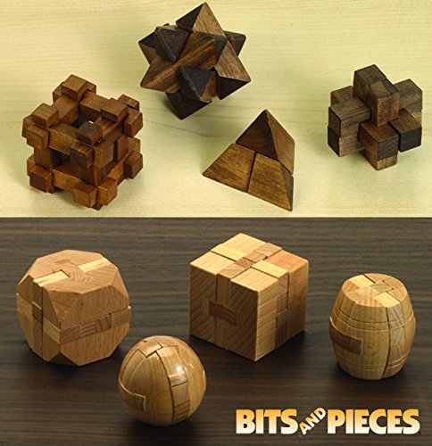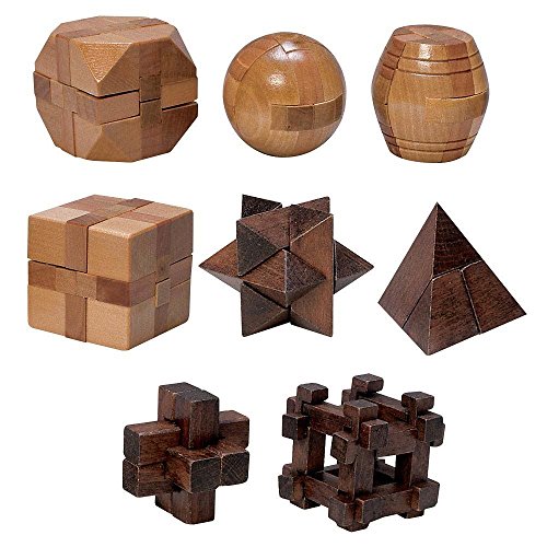 This item contains the following puzzles: - Set of Four - Natural Wood Puzzles - Set of Four - Dark Wood Puzzles Each of these wooden brainteaser sets contain four classic designs from the first brainteasers known. Can you take them apart and put them back together again without losing your patience? Solutions included. Each puzzle measures approximately 5cm x 5cm.