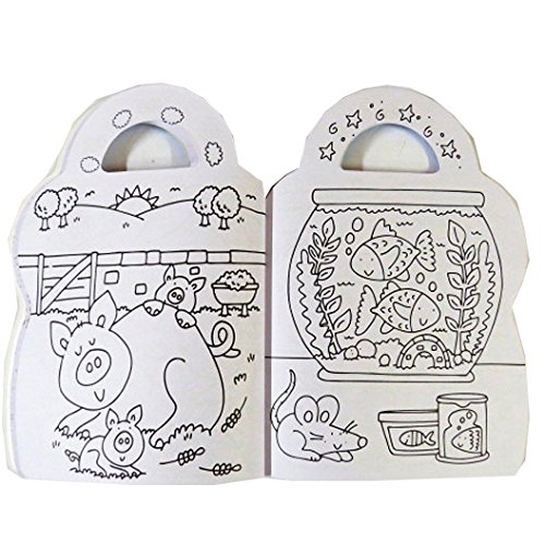 This beautifully made Children's carry colouring book measures 285mm x 206mm. Comes with a solid card front and back cover, cut out window and gloss laminated for additional protection and quality. Inside this colouring book it includes a colourful themed sticker sheet and 48 beautifully illustrated colouring pages. This colouring book is die cut to a fun shape and includes a large carry handle, perfect bound on the left edge (285mm). Wonderful product, perfect for rainy days and a fun way for young ones to express themselves.