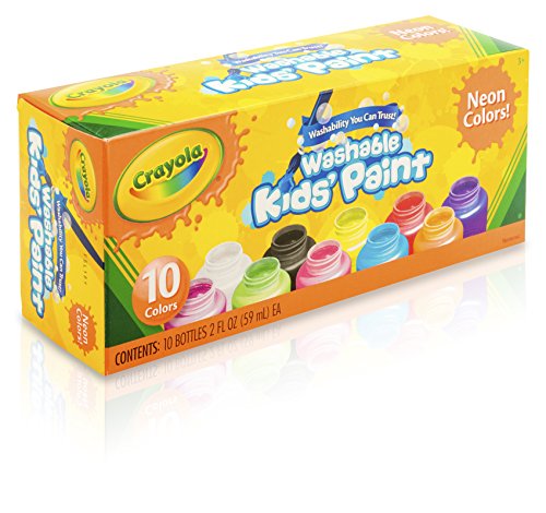 CRAYOLA-Washable Neon Paint. Add a vibrant, iridescent look to your creative masterpieces! Crayola washable kids paint is a nontoxic water-based paint that is great for art, crafts and school projects. Decorate book covers, signs or posters. Use various brushes, stamps or sponges to create interesting patterns and designs. This package contains ten two ounce bottles in neon colors. Conforms to ASTM D 4236. Recommended for ages three and up. WARNING:CHOKING HAZARD-Small Parts. Not for children under three years. Made in USA.