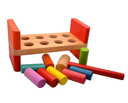 This Wooden Hammer Bench Educational Toy Set is made of wood and coated with a non-toxic finish. This Pound-A-Peg toy has a peg board with 8 colourful pegs and 1 hammer. Just pound the eight pegs into the wooden bench, then flip it over and start again. The hammer peg is a great preschool education toy for stimulating an infants brain and enhance the hand-eye coordination,develop their ability. It is a ideal gift for toddler.