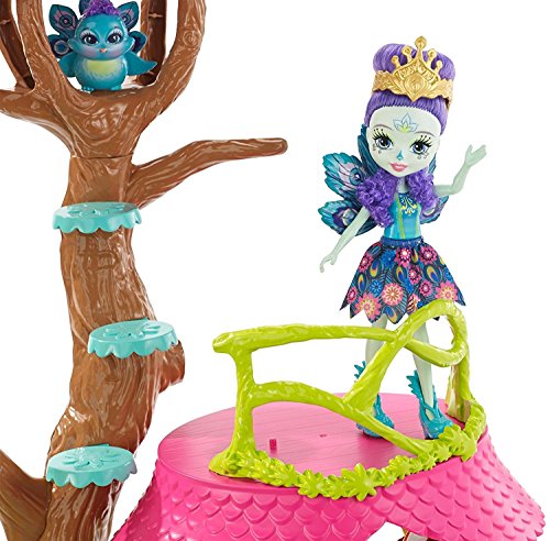 This panda playhouse set, inspired by the world of Enchantimals, is absolutely enchanting! The exclusive Enchantimals Prue Panda doll and her panda friend Nari are right at home with multiple levels and plenty of rooms to play out forest days and fantasy stories. There's a kitchen with a table and seating, plus food for the two friends. The bathroom has dual accessories for toilets and sinks with one big accessory for the doll and one small one for her bestie. Take the stairs in the tree to the second floor or use the elevator -- it's shaped like a nest and moves between the floors with child activation. Upstairs the panda can sit on a branch, the two friends can stargaze on the balcony and they can sleep with sweet dreams in the bedroom -- bunk beds with a ladder are so fun! At the top of the tree is a lookout, and in the middle is a play area with two swings (one for the Enchantimals doll and one for her animal friend), plus an animal-sized slide. The exclusive figures are adorable.