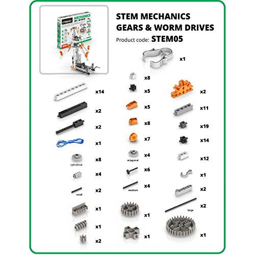 With Engino MECHANICS: Gears & Worm Drives set learn how Gears can easily reduce or increase speed, change force or transfer motion from one position to another. Discover how Worm drives are used to greatly reduce rotational speed and how screws can convert rotational motion to linear, while greatly increasing force. Build 12 working models such as an experimental crane, a gearbox, a carousel, a helicopter, a screw press and a crane with a rotating arm. You can find easy-to-follow building instructions for all models either online or in the booklet included. The booklet provides detailed explanations of the different scientific principles applied and incorporates innovative experimental activities for hands-on learning. A Quiz section is also available to challenge your newly acquired knowledge! Conduct thorough experiments and discover - How the handle's position affects force and speed - How the crank's position affects force and speed - How to calculate the mechanical advantage of a screw - What a worm drive is and how to use a ratchet mechanism. The Engino Building System was invented by Costas Sisamos, a former teacher and engineer for the purpose of helping students build technological models creatively and easily to experiment and learn about science and technology in a way that includes all the benefits of play. Research grants from local and E.U. sources helped transition the three year research project into an innovative product. Since then Engino has developed more snap-fit components such as gears, pulleys, motots, and solar panels. The major advantage of the Engino system is that it's design flexibility enables children to build simple or complex models quickly using a small number of components.