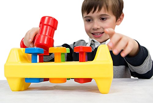 First released in 1987, this workbench features a hammer and colorful pegs that teach children about tools and motor skills. Because the pegs are permanently attached, the fun never ends - children can use the hammer to pound them flat, then turn the bench over and continue to pound away. This classic form of play makes the Tap 'n Turn tool bench a timeless toy.