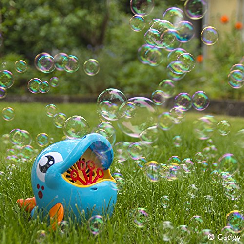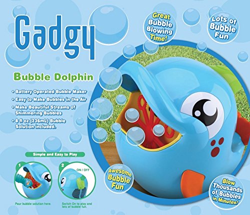 This cool dolphin shaped bubble machine will provide hours of fun. Due to the rotating bubble wands, the machine can blow hundreds of magical bubbles out of his mouth. Great for active and imaginative play. Place it in the garden and watch the bubbles float around in the breeze. Create a fun, 'bubbly' atmosphere at parties. Pour in the bubble liquid (236 ml. included) and switch the Bubble Blower on to start the fan up and get the bubble wands rotating. Works with 6x AA batteries (not included). Sizes +/- 19,5 x 19,5 x 16,5 cm.