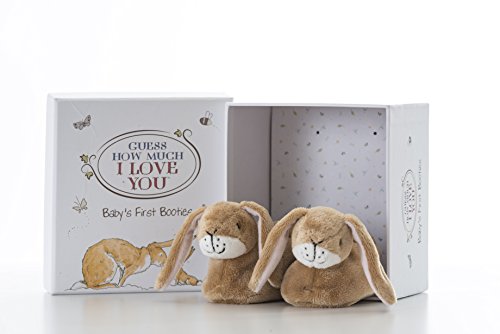 From the endearing Guess How Much I Love You picture book these adorable Little Nut-brown Hare booties are made from super soft plush with cute embroidered features and a rattle in each toe. Watch your baby discover the sounds in their feet and the joy on their faces as they develop their gross motor skills and learn how to make them rattle. Also comes with a cute little gift box to make a perfect present for New-borns. Available in this beautiful nursery collection are Little Nut-brown Hare Bean Rattle, Little Nut-brown Hare Comfort Blanket, Activity Spiral, Nut-brown Hare Soft Toy and Peg Puzzle.