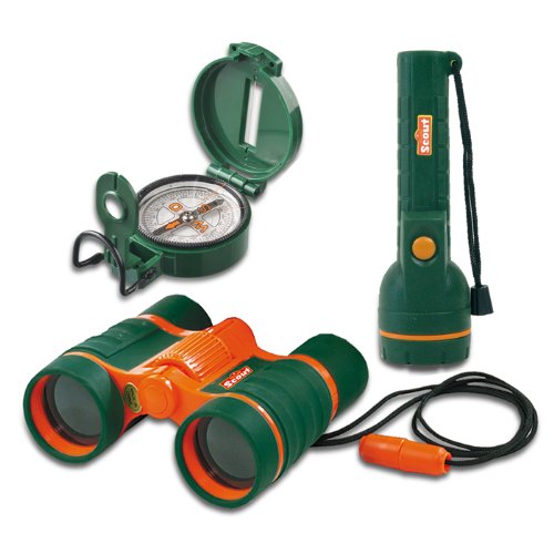 Discoverer set consisting of: Flashlight with 3 superheal LEDs, robust rubber-coated housing; Binoculars 4x32 mm with robust rubber-coated housing, sensitive focus adjustment, eyepiece rubber pad, safety collar; Pocket compass with visor device, oil-lubricated for reliable data, easy-to-read rose, robust plastic housing approx. 56mm diameter