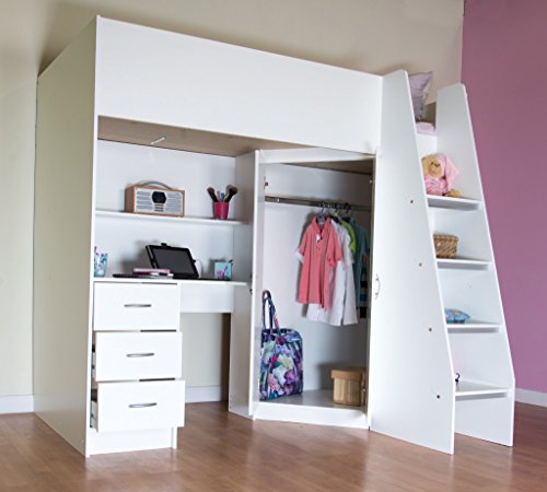 NEW British made High sleeper cabin bed with wardrobe, drawers and shelving built in suitable for ages 6 and above. MADE TO BRITISH STANDARD EN747 THE BRITISH AND EUROPEAN STANDARD FOR HIGH SLEEPERS The main cabin bed carcase is made from quality Melamine coated board, it is not just paper covered board. This exciting stylish children's high sleeper bed, which includes a bed base with 'breathing' holes, takes a full 3 ft mattress and comes flat-packed for easy home assembly! It is made to British and European Standards by ourselves in the UK and supplied to major European retailers. The high sleeper bed has a double door wardrobe with hanging rail (95cm long) and shelves, a desk with three drawers and room for a PC tower. Behind the large corner desk of the high sleeper are shelves, so making this a complete teenager/ children's bedroom in one high sleeper cabin bed (note the desk corner may be angular or rounded). Loft bed style high sleeper cabin beds need to be made to a different standard than normal low beds for obvious safety reasons, the design tests include stability and ladder safety as part of the criteria. This Bed is made of melamine faced wipe-clean, scratch resistant board, it is the same type of material that is used to make expensive kitchen carcases. The cabin bed is very robust when assembled. Mattress, Bedding and textiles ARE NOT included in the price. For safety reasons the maximum thickness of mattress for this bed is 15cm. THIS CABIN BED HAS THE LADDER ON THE RIGHT HAND SIDE, AND IS NOT REVERSIBLE. Bed measures approximately 203cm long x 94cm wide (up to 144cm where the ladder fits) x 173cm high. The ladder is 36cm wide internally. Delivery of this cabin bed is ONLY possible by a driver to mainland England, Wales and south of (and including) Glasgow/Edinburgh regions of Scotland, but delivery may take 5-15 working days depending on geographical area (Scotland may take a little longer).