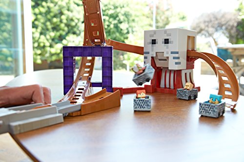 Launch a Hot Wheels Minecart with mini-figure at the Minecraft Ghast from the popular video game!; Defeat a Nether-dwelling Ghast by launching your Minecart and favorite Minecraft mini-figure up the loop; When the Ghast opens its mouth, move the launcher, aim your Minecart and mini-figure to enter and defeat the menacing mob!; The set includes styled track pieces that resemble the wildly popular video game, a Pigman Minecraft mini-figure and one Hot Wheels Minecart; Simulate authentic game moments and live out your Minecraft adventures with Hot Wheels!