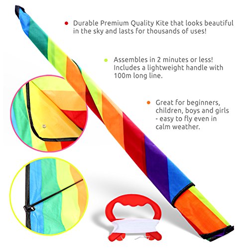 GO FLY! In this high-tech age, it's time to bring back the simple pleasures. So pack a picnic, grab the children, and head out to the park with our beautiful Veluxio flyer. LOOK COOL! Check out the action shots above! The big, bright construction will make you the envy of the neighborhood- not only does our classic toy look great with its vibrant red, orange, yellow, green, blue and purple stripes, but it is designed to be effortless to fly, even in a light breeze. The string is kept tangle free on the plastic handle, which is easy to hold even for a toddler (3 years and up with adult supervision). Click Add to Basket to order yours today!