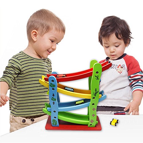 Put a car at the top of the track, and watch it click and clack its way down the four colorful tracks.