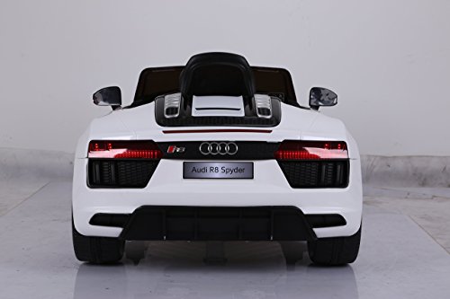 The licensed R8 Audi Spyder 12V ride on car. The popular R8 Spyder and fully licensed by AUDI, this ride on car is going to be turning heads just as much as the real life car. Made for children as young as 3 this 12 volt ride-on car shares the R8 Spyder's beautiful exterior design but has a few tricks up its sleeve the original doesn't, this toy car has been made and designed exclusively with kids and fun in mind. The high/low speed settings mean that no matter their ability your little one will be able to master the basics of this 12 volt ride-on in no time, there's reverse, rear suspension, seat belt and opening doors as well as the 2.4G parental remote control which is something you defiantly don't get with the original R8 Spyder. FEATURES One button starting Licensed by Audi 12 volt Ride on High-low speed Forward and Backwards Music and MP3 port Sound Controls Front and rear LED light 2 Opening Doors Power indictor Back wheels with suspension Seat belt 2.4G remote control