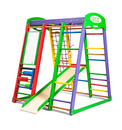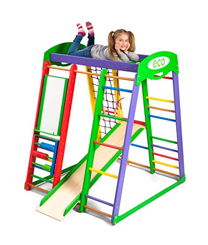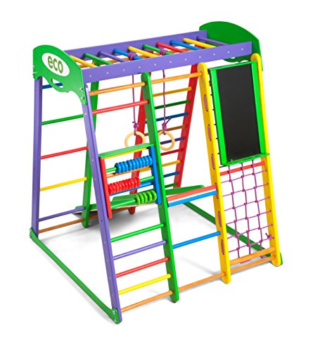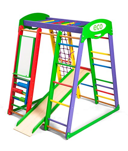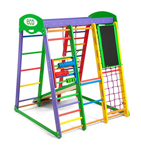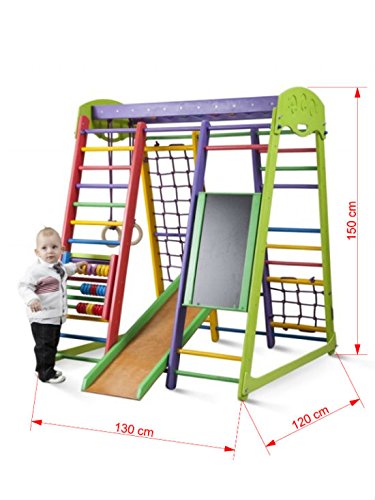 Children's home gym is a sports assembly for children, it can also be a memorable gift for a child's birthday. Children can learn to climb the ladder, lift themselves on poles, hang on the rings and climb the rope climbing net. This assembly allows the performance of all these elements, which are very useful for the child`s health, developing coordination and motor skills, it also provides high-quality entertainment. Beech and birch, from which the assembly is manufactured, give this sport center remarkable durability. Children's home gym is lightweight, does not require any attachment. It is a compact and well-designed sports and gaming center, which can be transported without special effort and is quick and easy to install.