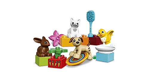 Take a trip to the park to play with all the Family Pets! Young children will love to create stories with this inspiring collection of animal figures they can throw the flying disc for the dog, groom the cat with the brush, give the bird a bath and feed carrots to the rabbit. Add these loving pets to other Lego� Duplo� My Town sets for endless animal fun.