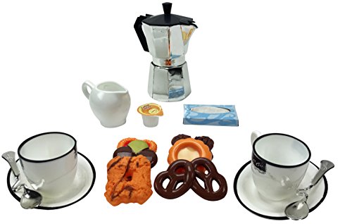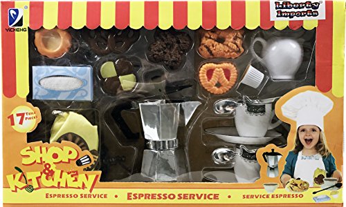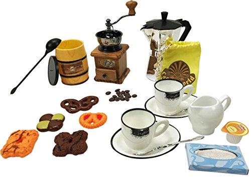 When this realistic play set meets with imagination, we offer more than just fun for kids! In role-play, kids are the little chef in their grand kitchens. They grind the coffee beans, make a cup of well-prepared espresso, bake some good cookies and have friends over for a moment together. The play set comes with complete parts of a coffee meeting and is designed for long-term play with more than just fun! Includes Realistic Manual Coffee Grinder, Espresso Pot and Classic Wooden Coffee Brewing Bucket. Cookies, Desserts, Cups & Saucers for 2 Settings. Coffee Bean Bag, Creamer, Spoons and Tissue Pack.A Perfect Addition to your Little One's Kitchen. Recommended: Ages 3 and Up