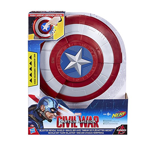 Captain America fights for battle victory with superhuman strength, agility, and an indestructible shield. He's America's first Super Soldier, fighting fearlessly on the side of justice. Kids can imagine what it's like to battle like Captain America with this Blaster Reveal Shield, which includes 2 launching projectiles. Just push down the star button to watch the shield open, revealing a hidden blaster designed to take enemies down. Heroes in training can also use the shield as protection, and when they reveal the blaster, they'll have the ultimate weapon. Captain America Marvel Civil War Blaster Reveal Shield is suitable for ages 6 years and over