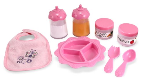 Little mummies can take care of their favourite baby dolls with this adorable 8-piece set, featuring an easy-close embroidered bib to keep dolly clean during mealtime and an array of realistic pieces, including "peas and carrots" and 'applesauce', as well as 'juice' and 'milk' bottles with liquid that disappears when baby 'drinks'. Take care of baby with this adorable eight piece set Easy-close, embroidered bib, keeps baby clean during mealtime Includes disappearing orange juice and milk bottles Applesauce and peas and carrots are ready to serve in divided dish Recommended for children 3 years and up