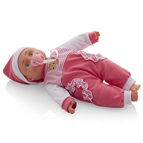Capricci by Bambolina is just like a real baby; she loves her dummy! Take her dummy out and she cries, put her dummy back in and she's happy and makes realistic suckling noises. She has an ultra soft and cuddly body and soft vinyl features. At 36cm in size, she is the perfect size for any dolls buggy or bed. She comes dressed in supersoft pink & white teddy romper suit with matching bonnet. Her clothes can easily be removed for washing.