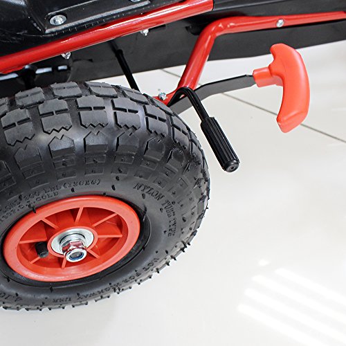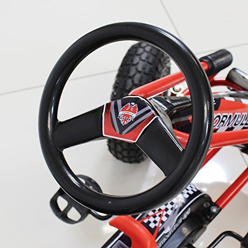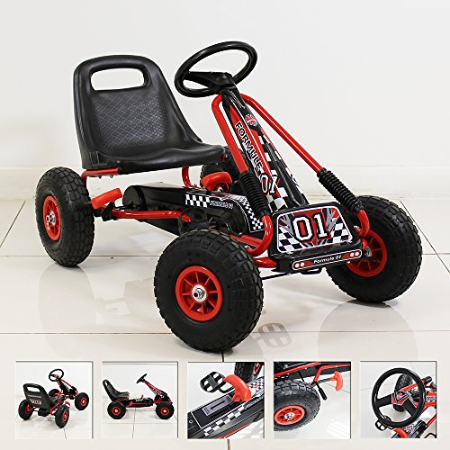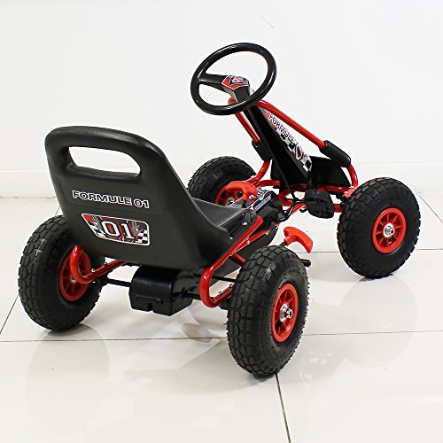 Your children's most wanted present this summer is going to be this fantastic go kart. Available for immediate despatch, this pedal operated go kart will provide hours of outdoor fun and low impact exercise for your child. It's not only looking cool, but also is packed with plenty of safety features such as hand operated rear when brake, fully enclosed chain and durable steel frame and axle. The Go Kart is fully certified to EN-71, series of standards for toy safety. Great quality, easy to assemble and an adjustable seat so children can continue to have fun as they grow! Other Information: • Children should be supervised by an adult at all times when using the vehicle. • Maximum weight limit: 50kg • It is essential for your child's safety and optimum performance of the product that you fully read and follow all instructions before use. Make your child aware of possible hazards when using this product. • This vehicle must not be used on public highways. Only to be used on private property with the permission of the owner. • Appropriate protective equipment such as safety helmet and knew and elbow pads should be worn at all times. • Product contains small parts - choking hazard! Keep your child away during assembly • Regularly check the screws, steering and seat connections and tighten if necessary. Regularly check for damages.