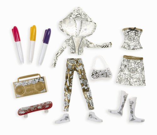The Moxie Girlz Art-titude Designer game gift set includes many outfits to size of a trousers, a pair of shoes, a pair of boots, a skirt, a corset, a bag, a sweater, a skateboard and a ghettoblaster. This Art-titude accessories are suitable for the Moxie Girlz dolls 20 cm Sold Separately. The set Art-titude also contains 3 pens. For ages 6 and over.