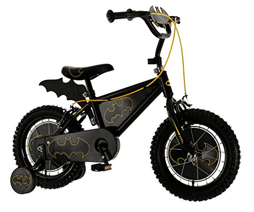 Awesome Batman 14 Inches bike with bat plaque and fin! 35cm (14") spoked wheels with pneumatic tyres. Bat shaped plaque and fin. Printed wheel discs. Printed frame insert. Fully enclosed printed chainguard. Front and rear caliper brakes. Adjustable handlebar height 69-71cm. Adjustable seat height 49-55cm. For ages 4 years and over.