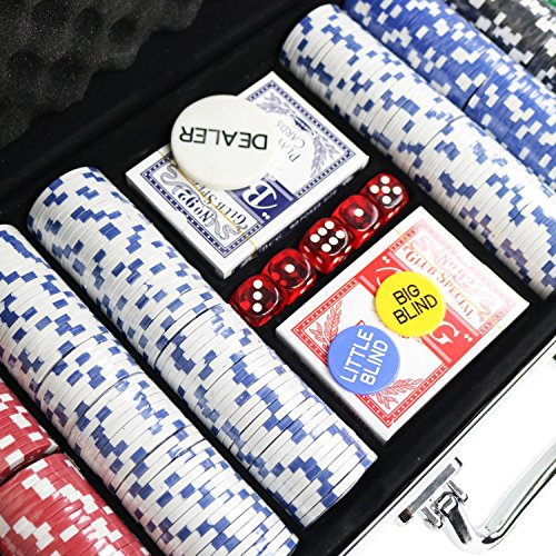 Poker Set - 500 Piece Complete With Chips Cards Dice And Casino Style Case Sit down with a with a few friends lay this luxurious set out on your table and feel like you';re playing poker in a Las Vegas casino! 500 Professional Suited Poker Chips 11.5 Gram Poker Chips 500 Casino Poker Chips 2 Decks Of Playing Cards 5 Red Dice 1 Dealer Marker 1 Big Blind Marker 1 Little Blind Marker 1 Heavy Duty Aluminium Case Chips Included: 150 x White 11.5 Gram Poker Chips 150 x Red 11.5 Gram Poker Chips 100 x Green 11.5 Gram Poker Chips 50 x Blue 11.5 Gram Poker Chips 50 x Black 11.5 Gram Poker Chips
