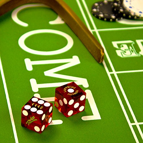 Every casino die is like a little piece of art. Jumbo-sized 19mm sides, flush pips for perfect balance, and sharp, razor edges for random rolls. A mechanically-machined masterpiece, manufactured to exacting, stringent specifications to suit the needs of casinos the world over. This particular pair of dice comes straight to you from the craps tables of the Rio Casino. The 2 side of every die bears the casino's logo, and the words Las Vegas, Nevada encircle the 1 pip. Between the pips of the 6 side is a gold, hot-stamped serial number which ensures authenticity and keeps players honest. Rest assured, these aren't unused replicas, nor are they factory seconds. These are the genuine article. The proof, aside from the gentle wear and tear from seeing action on a thriving casino floor, is the subtle markings usually found on the 4 side of every die. To prevent tampering, casinos change out all dice every shift, and once a set of dice has seen its share of action, it is discreetly "cancelled" using a small mark that doesn't affect play, but does ensure these cancelled dice don't see casino play again. The Rio uses a small pinprick. But that mark won't stop you from playing at home! So pick up a pair of these authentic casino dice and bring a little piece of Vegas to your next game night.