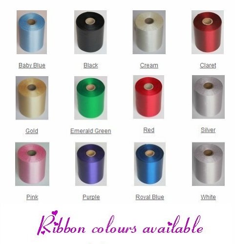 Choose your ribbon colour from the following colours: Baby Blue, Black, Claret, Cream, Emerald Green, Gold, Pink, Purple, Red, Royal Blue, Silver, White Choose your print colour from the following colours: Black, Blue, Burgundy, Green, Matt Gold, Matt Silver, Pink, Purple, Red, White Please note that the silver print will not show up on the pink, baby blue, ivory or white ribbon. In this instance we can print pink, blue or white on the silver ribbon if this is your theme.