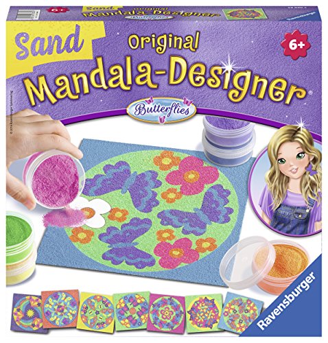 Ravensburger Mandala-Designer Sand Butterf\\n\\nZand-mandalas zelf maken! Met de mandala-sjablonen en het gekleurde zand ontstaan hele mooie zand-mandalas. Gewoon de folie er op de gewenste plaats afhalen en het zand erop strooien. Met de verwijderhulp met doseerlepel gaat dat heel makkelijk. Plezier gegarandeerd! \\n\\nInhoud: 8 mandala-sjablonen, 6 potjes zand, 1 verwijderhulp met doseerlepel, 1 handleiding\\n\\n\\n 6+ 27 x 27 x 6 cm 1 vrij
