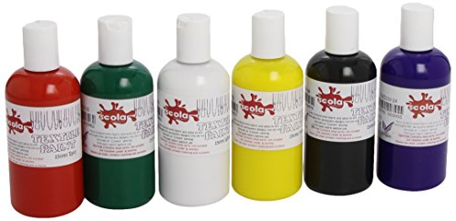 Product Description There's nothing more satisfying than wearing your own designs, and with these textile paints this is easier than ever. The Scolaquip Textile Paint range is a great range of ready to use, water based fabric paints. Paint directly onto the fabric, then make the designs permanent by ironing on the reverse. All of the colours are intermixable to make a rainbow of colours and shades. Suitable for children aged three and over, adults should complete the ironing process for young children and supervise with older children. Since 1920 Scolaquip has continued the manufacture of non-toxic, high quality colour products for use by children Box Contains 6 x 150ml Bottles