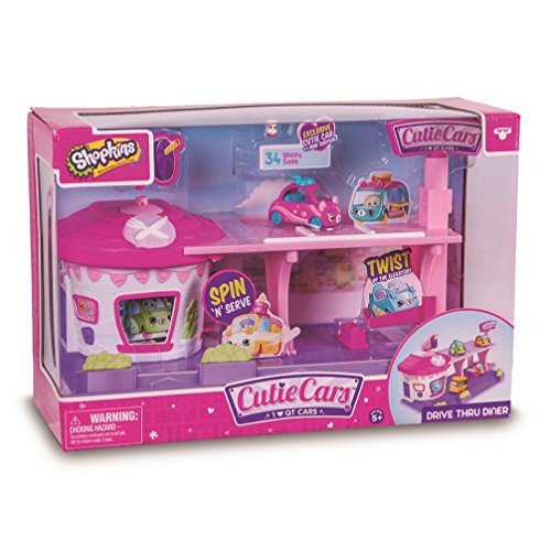 Cutie Cars are a range of Shopkins themed die-cast collectible cars! Simply lift the removable roof, put your mini Shopkins in the Cutie Car, place the roof back on and take your mini Shopkins for a ride. Hungry for some fun? Fill up at the Cutie Cars Drive Thru Diner! Pop in your Mini Shopkins for a spin in the rotating drive thru window and serve up some fun! Ride up the elevator and check out the sky deck! Grab a meal on the go or pull up a tray at the parking bay! The Shopkins Cutie Cars Diner Playset includes an exclusive Wizzy Soda Buggy Cutie Car & Mini Shopkins. Wizzy Soda has the fastest straw in the west and dislikes running out of gas! The playset has a rotating drive through with window opening and car ejecting feature! Twist your Cutie Car up in the lift, rest your Cutie Cars in the parking and dining areas and drive them up to the sky deck display platform.