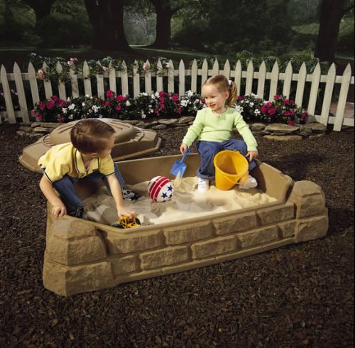 This versatile sandbox/planter combines outdoor textures and nature's colors to offer a contemporary look in today's neighborhoods. The warm sandstone color and stone boulder textures look realistic and feature four molded-in cornerstones which provide seating. The friendly sunshine lid motif is tastefully inviting, and the lid protects sand from weather and pets. The sandbox holds 200 pounds of sand and comes fully assembled.