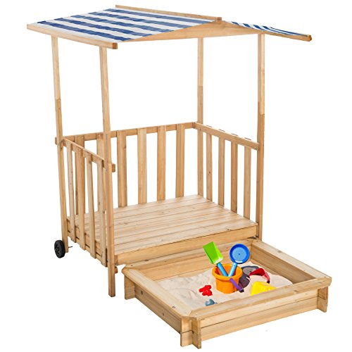 This beautiful sandpit is the ideal toy for your children. Equipped with a roofed veranda, the children are protected from the sun when playing, for example. The veranda can be pushed over the sandpit via rollers and thus protects the sand from rain or animals.
