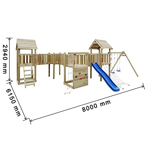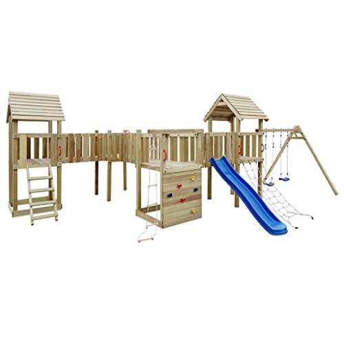 With this UV-resistant playhouse set, you can turn your backyard into a fascinating playground! This playhouse set is constructed from solid, pressure-impregnated wood, and sturdy plastic in bright colours. It consists of a wooden frame, a wave slide, 2 swings, and some climbing facilities. With all of these features, this comprehensive playset can be used for climbing, crawling, hiding and sliding. The wooden playhouse is extremely strong, weather-resistant and durable. The hand grips bring extra safety when climbing. Parents can therefore have peace of mind when their children are playing on a quality playset that is up to safety standards. This outdoor play tower provides plenty of space for friends to join in the fun and enjoy the array of features. Please note that wood is a natural product and can show imperfections. For assembly a drill is needed. To ensure a sturdy structure, some of the holes are predrilled and others still have to be drilled during assembly.