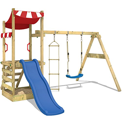WICKEY Wooden playhouse FunFlyer Playground Climbing frame for children with swing sandpit climbing ladder, blue slide + red tarp