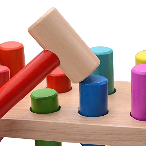 Classic knocking wooden pounding bench . Pounded both side with the included hammer. Eight different coloured pegs help in counting . For Small foot kids, children,babies and toddlers . Used in Nursery, Montessori and for home schooling kids . Improve hand-eye coordination Strengthen Muscle. Develop fine motor skills . Bright coloured help kids in recognition colour.Detachable side to hammer first.